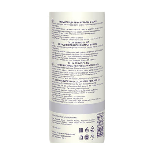 Гель для удаления краски с кожи является профессиональным средством для удаления остатков краски с кожи головы, остающейся после процедуры окрашивания. Средство содержит в себе специальную формулу, которая качественно очищает кожу головы от остатков краски, при этом не повреждает и не раздражает ее. Витаминный комплекс не влияет на структуру окрашенных волос и не смывает краску. Средство не содержит агрессивных компонентов, способных вызвать аллергическую реакцию.