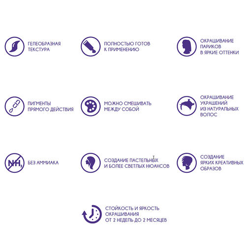 Гелеобразная текстура красителя идеально подходит для создания креативных работ. Содержит пигменты прямого действия нового поколения. Позволяет добиться ювелирного градиента при сложном окрашивании, создавать яркие и пастельные оттенки, изменять оттенок мелированных и осветленных волос. Полное отсутствие аммиака делает окрашивание абсолютно комфортным. Особая формула ухаживает за волосами во время окрашивания, придает гладкость, шелковистость и роскошный блеск. Краситель полностью готов к применению.
