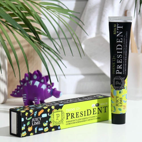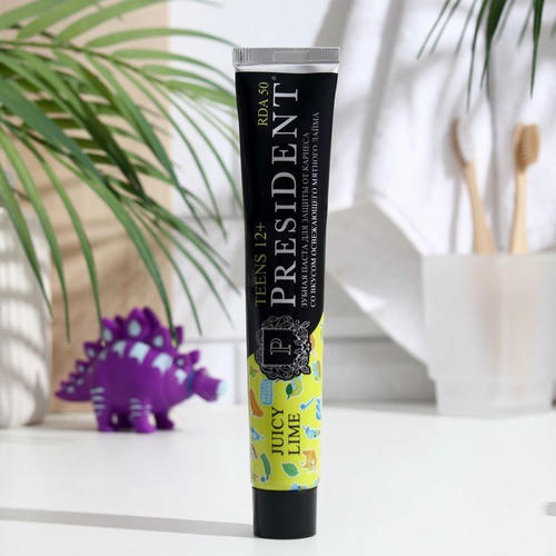 Детская зубная паста PRESIDENT со вкусом сочного лайма для подростков от 12 лет на 98% состоит из натуральных компонентов и обеспечивает защиту от кариеса, длительный и эффективный уход за зубами и заботится о здоровье десен.