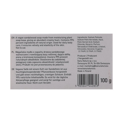 Веганское мыло с ароматом сандалового дерева изготовлено на основе увлажняющих растений, образующих густую кремообразную пену. Оно содержит 99% натуральных ингредиентов. Используется для ежедневного ухода за телом, придает коже бархатистость и эластичность.