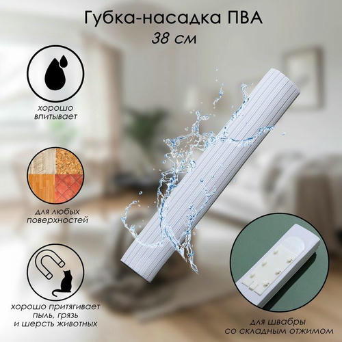 Насадка для швабры ПВА превосходно убирает грязь, пыль, волосы и шерсть животных, а также отличается хорошей впитываемостью.