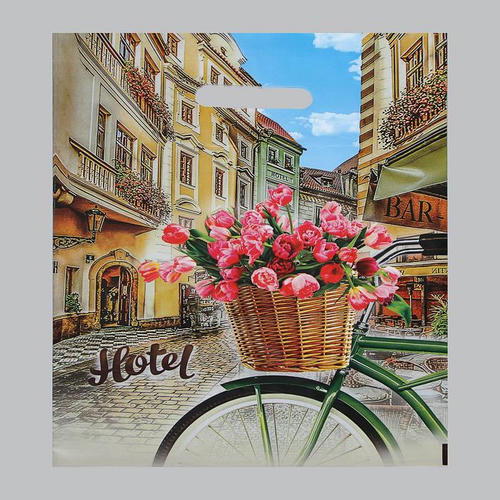 Пакет полиэтиленовый с вырубной ручкой, прочный с оригинальным рисунком.