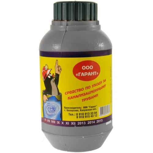 Средство для прочистки труб “КРОТ” порошок 500 гр эффективно устраняет засоры в сливах раковин, ванн, унитазов от органических загрязнений, пищевых остатков, жира, волос, бумаги и т.д. Содержит NATRIUMHYDROXID.