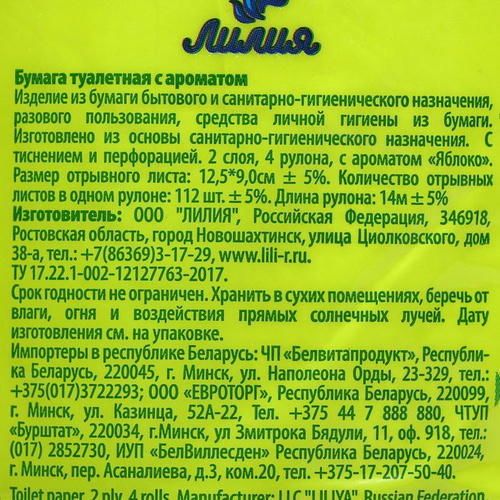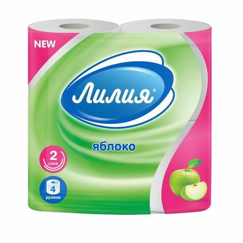 Туалетная бумага «Лилия» Яблоко, 2 слоя, 4 рулона, белый цвет
