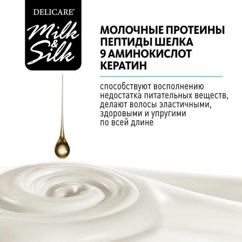 Шампунь для волос Delicare Milk&Silk «Питание и укрепление» идеально подходит для ослабленных и поврежденных волос. Питательный шампунь с помощью свойств молочных протеинов, пептидов шелка, 9 аминокислот и кератина способствует восполнению недостатка питательных веществ, делая волосы эластичными, здоровыми и упругими по всей длине. Кератин предотвращает появление секущихся кончиков и ломкость волос. Шампунь улучшает структуру волос, укрепляет по всей длине и защищает от повреждений, возвращает волосам гладкость и здоровый блеск. Средство деликатно очищает и эффективно ухаживает за волосами.