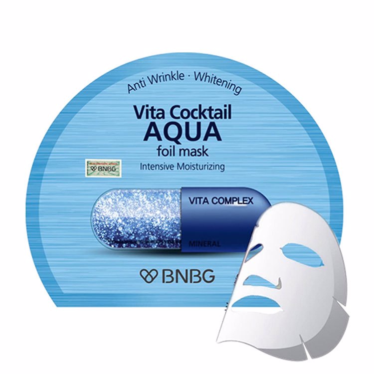 Banobagi Bnbg Vita Cocktail Aqua Foil Mask – увлажняющая восстанавливающая маска для обезвоженной, тусклой кожи. Лекало маски имеет 3 слоя: фольга + эластичный слой + 100% хлопок. Фольгированный слой помогает создать «парниковый эффект», благодаря которому активные ингредиенты попадают в глубокие слои кожи. Кроме того, маска не так быстро высыхает в отличие от обычных тканевых масок. Эссенция, которой пропитана маска имеет насыщенный состав: