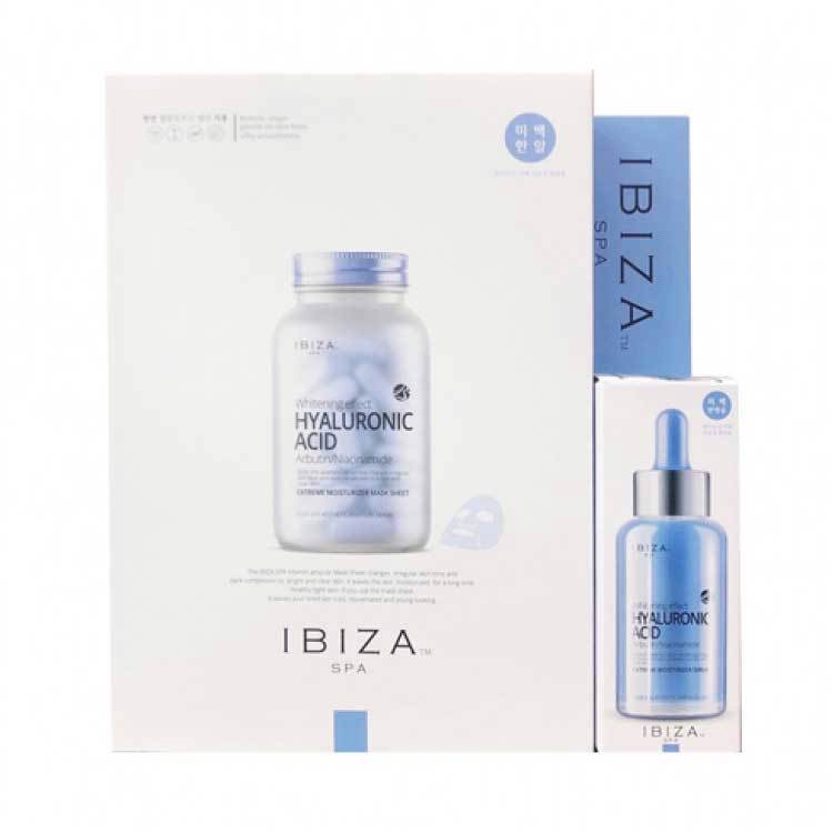 IBIZA SPA DOUBLE WHITENING EFFECT HYALURONIC ACID MASK SHEET (10pcs*30ml) – обогащенная отбеливающей эссенцией, одобренная корейским управлением по контролю за продуктами и лекарствами. Это отличное средство для снятия усталости и тусклости кожи. Это может уменьшить и предотвратить появление веснушек. Эта маска-лист охлаждает и омолаживает напряженную и уставшую кожу, поскольку она подтягивает и тонизирует цвет лица. Он гладко прилегает к вашей коже и глубоко питает.