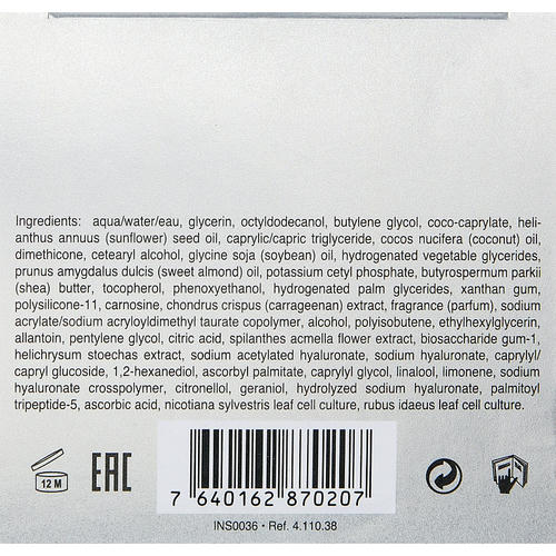 Aqua (Water), Glycerin, Octyldodecanol, Butylene Glycol, Coco-Caprylate, Helianthus Annuus (Sunflower) Seed Oil, Caprylic / Capric Triglyceride, Cocos Nucifera (Coconut) Oil, Dimethicone, Cetearyl Alcohol, Glycine Soja (Soybean) Oil, Hydrogenated Vegetable Glycerides, Prunus Amygdalus Dulcis (Sweet Almond) Oil, Potassium Cetyl Phosphate, Butyrospermum Parkii (Shea) Butter, Tocopherol, Phenoxyethanol, Hydrogenated Palm Glycerides, Xanthan Gum, Polysilicone-11, Carnosine, Chondrus Crispus (Carrageenan) Extract, Fragrance (Parfum), Sodium Acrylate / Sodium Acryloyldimethyl Taurate Copolymer, Alcohol, Polyisobutene, Ethylhexylglycerin, Allantoin, Pentylene Glycol, Citric Acid, Spilanthes Acmella Flower Extract, Biosaccharide Gum-1, Helichrysum Stoechas Extract, Sodium Acetylated Hyaluronate, Sodium Hyaluronate, Caprylyl / Capryl Glucoside, 1.2-Hexanediol, Ascorbyl Palmitate, Caprylyl Glycol, Linalool, Limonene, Sodium Hyaluronate Crosspolymer, Citronellol, Geraniol, Hydrolyzed Sodium Hyaluronate, Palmitoyl Tripeptide-5, Ascorbic Acid, Nicotiana Sylvestris Leaf Cell Culture, Rubus Idaeus Leaf Cell Culture