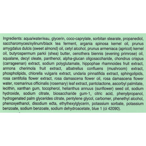 Аqua/Water, Glycerin, Coco-Caprylate, Sorbitan Stearate, Propanediol, Saccharomyces/Xylinum/Black Tea Ferment, Argania Spinosa Kernel Oil, Prunus Amygdalus Dulcis (Sweet Almond) Oil, Cetyl Alcohol, Prunus Armeniaca (Apricot) Kernel Oil, Butyrospermum Parkii (Shea) Butter, Oenothera Biennis (Evening Primrose) Oil, Squalane, Decyl Oleate, Panthenol, Alpha-Glucan Oligosaccharide, Chondrus Crispus (Carrageenan) Extract, Sodium Polyglutamate, Hippophae Rhamnoides Fruit Extract, Annona Cherimola Fruit Extract, Albatrellus Confluens (Mushroom) Extract, Phospholipids, Chlorella Vulgaris Extract, Undaria Pinnatifida Extract, Sphingolipids, Rosa Centifolia Flower Extract, Rosa Damascena Flower Oil, Rosa Damascena Flower Water, Rosmarinus Officinalis (Rosemary) Leaf Extract, Pantolactone, Ascorbyl Palmitate, Lecithin, Xanthan Gum, Tocopherol, Helianthus Annuus (Sunflower) Seed Oil, Sodium Hydroxide, Sodium Citrate, Biosaccharide Gum-1, Citric Acid, Phenylpropanol, Hydrogenated Palm Glycerides Citrate, Pentylene Glycol, Carbomer, Phenethyl Alcohol, Phenoxyethanol, Disodium EDTA, Ethylhexylglycerin, Potassium Sorbate, Potassium Benzoate, Sodium Benzoate, Sodium Dehydroacetate, Blue 1 (ci 42090)