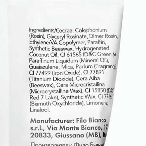 Состав: Colophonium, Glyceryl Rosinate, Dimer Rosin, Ethylene/VA Copolymer, Paraffin, Synthetic Beeswax, Hydrogenated Coconut Oil, Cl 61565, Paraffinum Liquidum, Guaiazulene, Mica, Parfum, Cl 77499, Cl 77891, Cera Alba, Cera Microcristallina, Cl 15850, Synthetic Wax, Cl 77163, Limonene, Linalool.