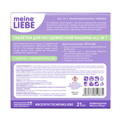 Бренд Meine Liebe (Майне Либе) принадлежит немецкой компании Grunlab – ведущему производителю бытовой химии. Под данной маркой представлены биоразлагаемые средства для стирки белья, уборки дома и мытья посуды, они не содержат фосфатов, хлора, агрессивных абразивов, ПАВ, отдушек. Производство товаров осуществляется на лучших заводах Европы и России, под тщательным контролем технологов и дерматологов.
