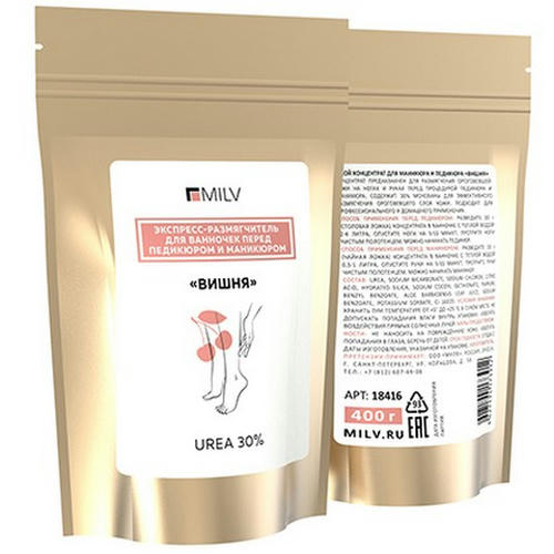 Сухой концентрат с 30%-ным содержанием мочевины предназначен для эффективного размягчения ороговевшей кожи на ногах и руках перед процедурой педикюра и маникюра.