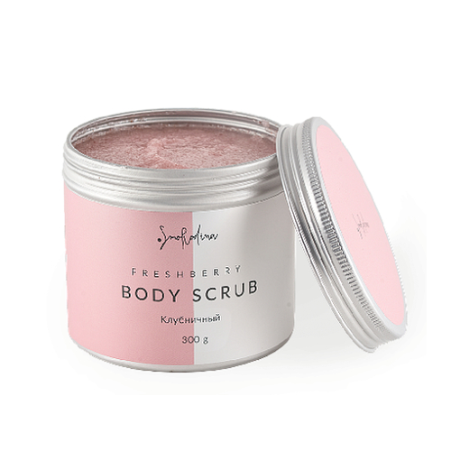 Натуральный сахарно-соляной скраб комфортной текстуры эффективно отшелушивает, смягчает, питает и увлажняет, не травмирует и не царапает кожу. Обладает приятным ароматом клубники.