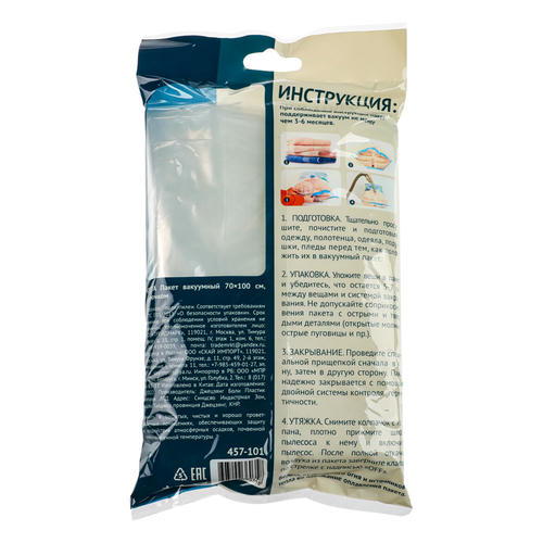 Подушки, одеяла, зимняя одежда, мягкие игрушки занимают много пространства в Вашем шкафу? Вакуумные пакеты с клапаном 70х100 см на 70% уменьшают пространство за счет откачки воздуха. Просто поместите вещи в пакет, закройте его с помощью застежки zip-lock, присоедините шланг пылесоса к клапану и откачайте воздух. А крючок в комплекте позволит удобно разместить пакеты с вещами на штанге.